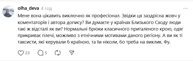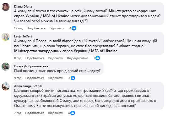 - «Бачу тут уже в коментах «жінка в сторону іншої жінки». Мабуть, є недолугі, яким треба пояснити, чому це не ок: Посол має знати, поважати та пристосовуватись до культури, традицій та порядку країни, в якій він служить».
