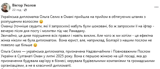 Окремо образ посла Ольги Селих прокоментував політолог Віктор Уколов. За його словами, образ посла був порушенням дрескоду та не відповідав рекомендаціям одягу для дипломатів. «Оманці (точніше саудити, які її запросили) мабуть були шоковані, бо ж запросили її на іфтар – вечерю після дня посту й молитви під час Рамадану. Звичайно, це дике порушення всіх правил і навіть виклик. Але чого ж ми хотіли – ця ефектна жінка ніколи не була дипломатом», – написав політолог.