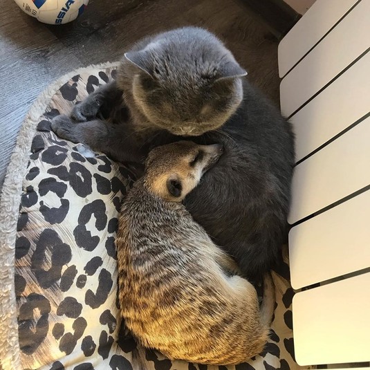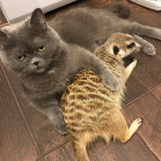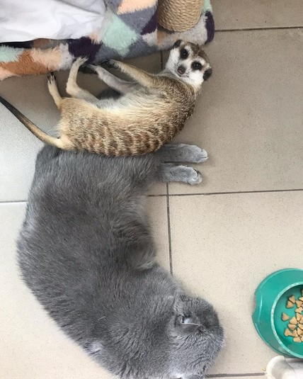Спасенный из контактного зоопарка сурикат дружит с котом и считает его вожаком: забавные фото