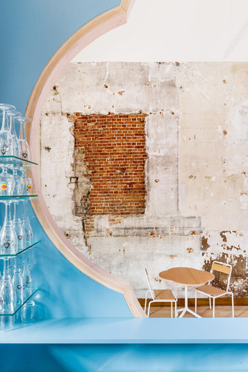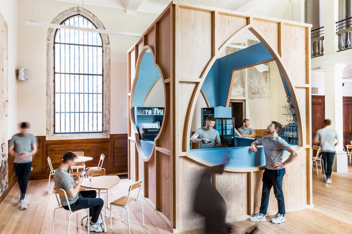 Дизайнеры из Van Staeyen Interieur Architecten, работая над интерьером кафе, вдохновлялись структурными элементами готического собора. Внутри часовни установили специальную деревянную конструкцию, которая служит баром, а вокруг нее расставили столики. Окна в импровизированном баре по форме соответствуют реальным окнам в соборе. В интерьере использовали бирюзово-голубой цвет, который повторяет оттенок на витражах часовни. Основатель студии Йохан ван Стайн называет этот стиль «современной готикой».