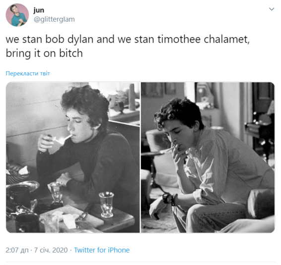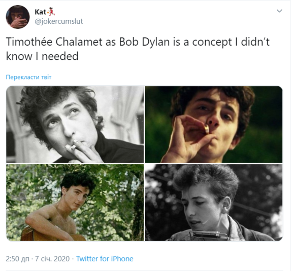 Тимоти Шаламе сыграет музыканта Боба Дилана в новом фильме Джеймса Мэнголда, режиссера «Логана» и «Ford против Ferrari». Об этом сообщает The Hollywood Reporter.