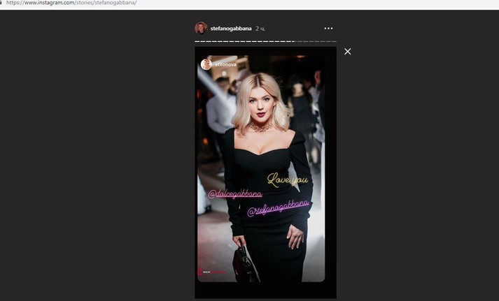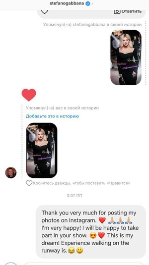 В ответ на «лайк» и публикацию своего фото Елена Филонова попросила Стефано Габбана стать одной из его моделей на показе