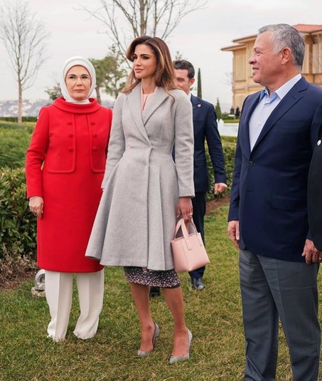 В субботу, 2 февраля, турецкий президент и его жена Эмине встречали гостей в собственной резиденции. В честь короля и королевы был устроен ужин в залах с высокими потолками и видом на пролив Босфор. Королева Рания надела шелковый костюм металлического оттенка, состоявший из блузы и юбки. Аксессуары играли не последнюю роль в образе: элегантный пояс серебристого оттенка подчеркнул тонкую талию жены короля, а туфли-лодочки и миниатюрная сумка на цепочке гармонировали с нарядом по фактуре и цвету.