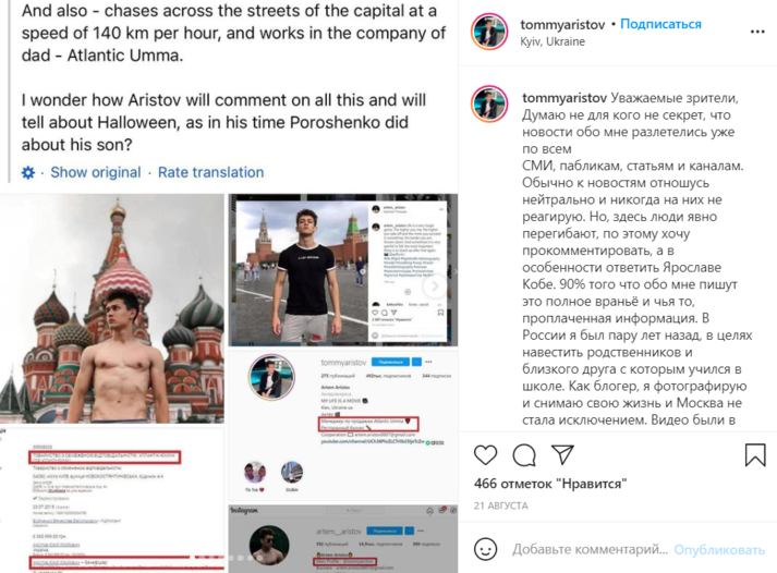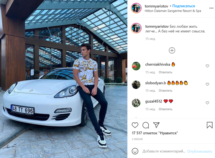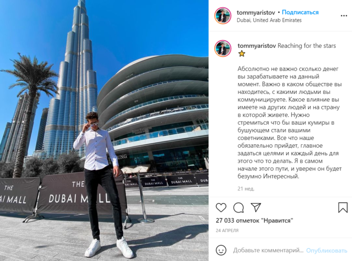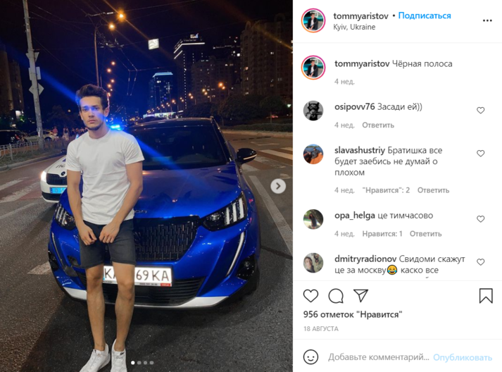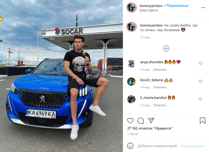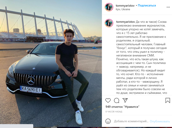 После очередной волны внимания со стороны журналистов Артем написал в Instagram сообщение, в котором возмутился, что его якобы не воспринимают как личность, а только как «мажора» и «приложение к отцу». На фотографии в заметке Аристов-младший вновь позирует, опершись на капот своей новой машины.