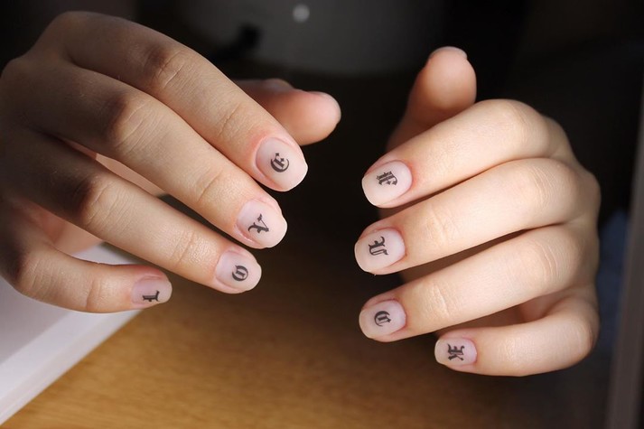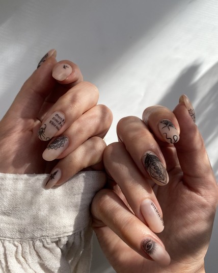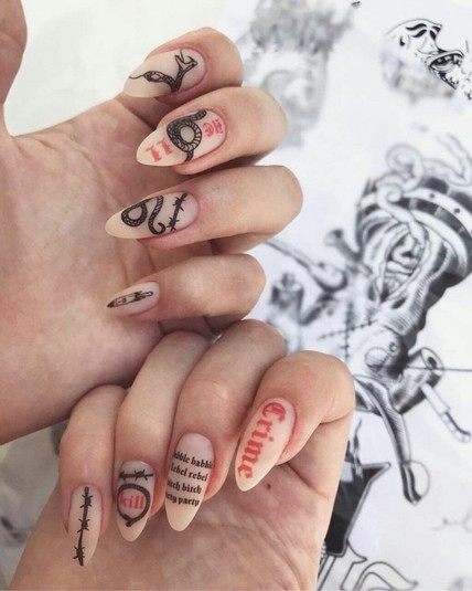 Примечательно, что тату в маникюре – это не тату в привычном значении этого слова. Для выполнения подобного дизайна используется специальная водостойкая пленка на бумажной основе. Ее прикладывают к ногтю, покрытому базой, а затем рисунок, который получился, закрепляют лаком. Процесс довольно быстрый и простой, а снимается тату также без особых трудностей – как и обычный гель-лак.