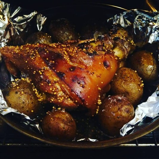 Секретные ингредиенты для натирания: порежьте чеснок и поместите его рульке под кожу. И самое главное – смешайте горчицу, ворчестерский или соевый соус и мед. Натрите рульку. Также можете сбрызнуть соусом картофель. Поставьте на большой огонь для корочки и подождите полчаса. Выключаем и наслаждаемся!