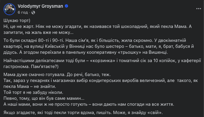 Політик наголосив, що мами не просто готують для дітей, а своїми стравами «дають спогади на все життя». Він звернувся до підписників з проханням згадати, які саме торти пекли вдома у ті часи, сподіваючись серед сотень рецептів впізнати той самий «свій».