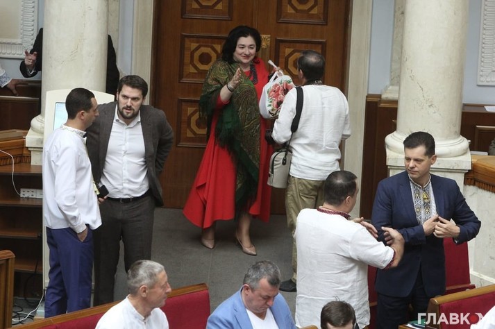 Женщины-депутаты одели в праздничный день вышитые длинные платья и блузки с вышивкой. Мужчины пришли в рубашках-вышиванках.