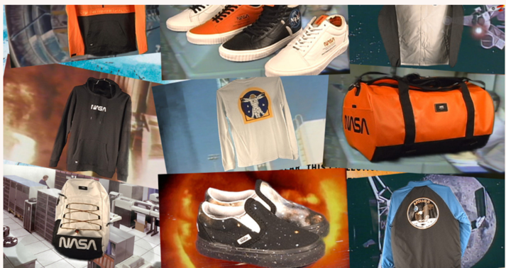 В серии использованы знаменитые модели бренда Vans, в том числе кеды Sk8-Hi, а также традиционная одежда и аксессуары. Однако их украшают изображения, связанные с историей NASA, включая патчи, вдохновленные миссией «Аполлон-11». Цвета одежды совпадают со стилистикой униформы работников космического агентства.