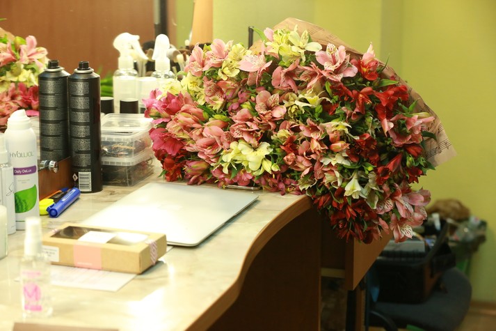 Во время паузы между конкурсами «Пять слов» и «Обмен ролями» продюсер шоу занес в студию шикарный букет альстромерий, завернутый в крафтовую бумагу.