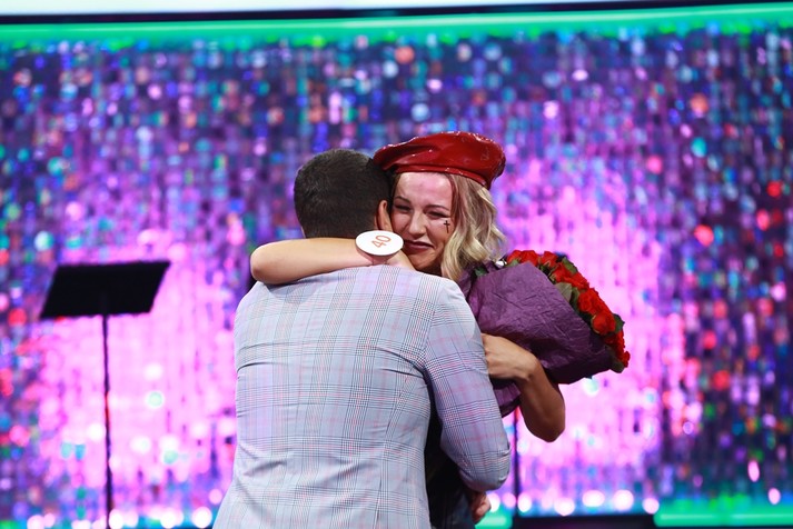 После этих слов Максим встал на одно колено и вручил Яне букет роз и кольцо. Все вокруг плакали, включая ведущую Нового канала Лесю Никитюк.