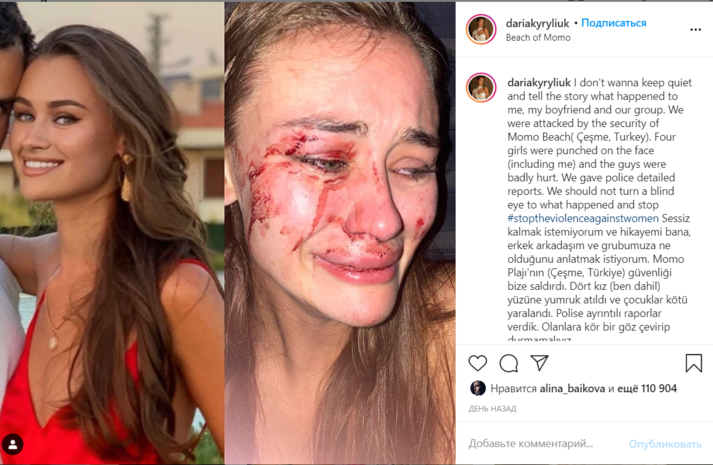 24-летнюю украинскую модель Дарью Кирилюк и ее друзей жестоко избили охранники пляжа Момо в Турции. Она рассказала, что отдыхала на пляже в Чешме вместе со своим парнем и несколькими знакомыми. В результате столкновения с охранниками все они получили травмы. Персонал пляжа, по словам модели, не стеснялся применять грубую силу не только к мужчинам, но и к девушкам.