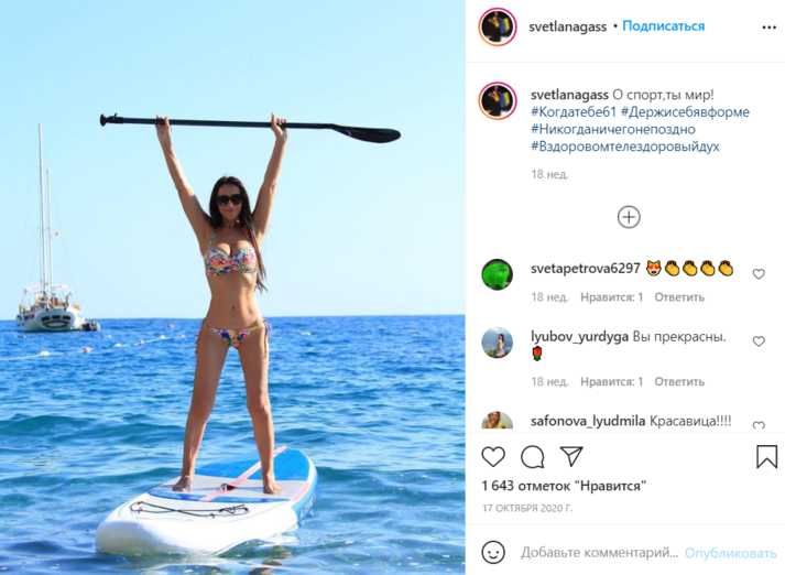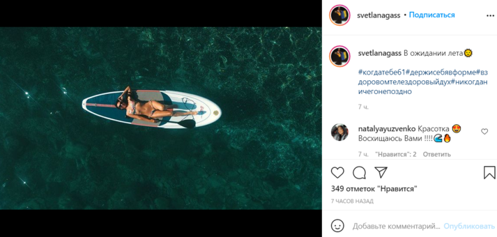 На своей странице в Instagram она опубликовала снимок, на котором позирует в ярком купальнике. Светлана лежит на доске для серфинга в голубой прозрачной воде (чтобы смотреть фото, проскролльте до конца страницы).