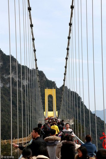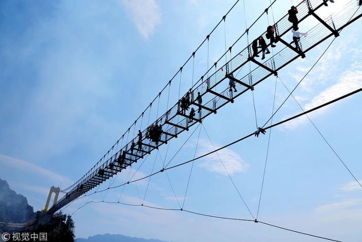 За счет прозрачного покрытия этого моста создается иллюзия, что пешеход на нем завис над пропастью. Конструкторы заверяют, что мост способен выдержать одновременно до 2 тыс. человек. Однако в целях безопасности на него не пускают более 500 человек.