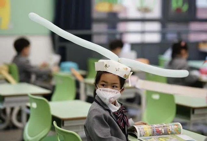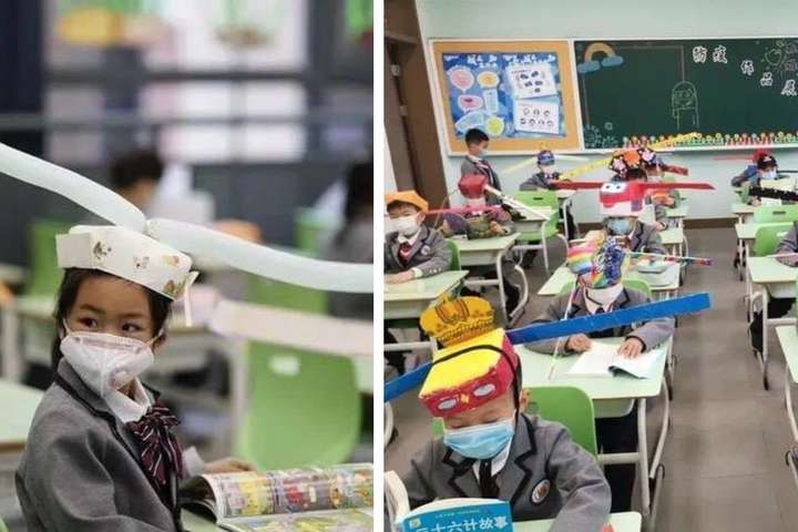 В Китае школьников заставляют носить смешные шляпы, чтобы научить их держать дистанцию