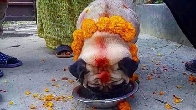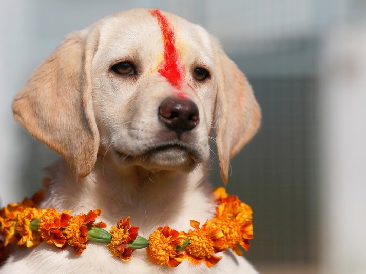 Всего он длится 5 дней, но второй день известен как Кукур Тихар или «День собак». Собакам дарят венки из цветов, вкусно кормят и благословляют Тикой - им на лоб наносят красную метку.