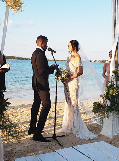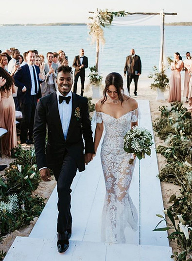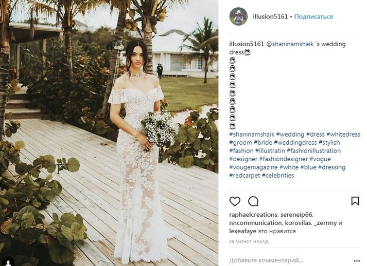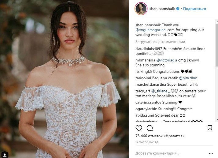 Торжество прошло еще 28 апреля на Багамах, но снимками с церемонии Шанина поделилась с фолловерами только сейчас. К алтарю она пошла в кружевном платье Ralph & Russo, босоножках Aquazzura и украшениях Lorraine Schwartz.