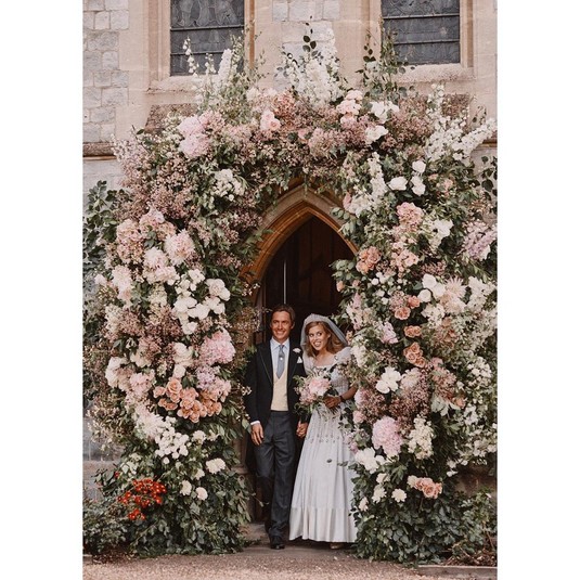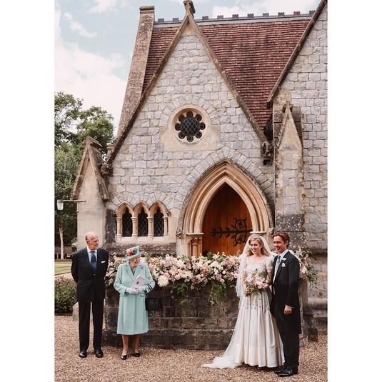 Букингемский дворец опубликовал два снимка со свадьбы: на первом фото молодожены запечатлены рядом с королевом и ее мужем с соблюдением социальной дистанции. На втором кадре новоиспеченные супруги уже позируют только вдвоем.