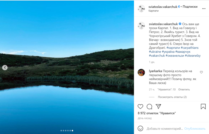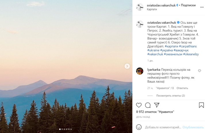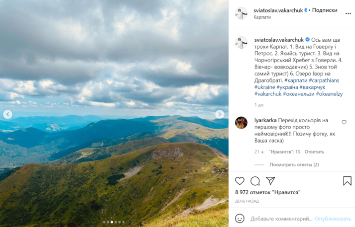 Судя из подписи к снимкам, Вакарчук уже успел побывать на горах Говерла и Петрос, а также посетил озеро Ивор на Драгобрате.