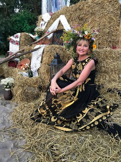 На ней Ирина запечатлена в длинном черном платье с необычными принтами, в венке из цветов и трав. Компанию Ирине составил супруг - Юрий Луценко.