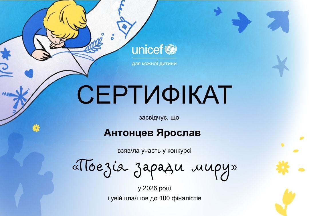 Вірш Ярослава Антонцева, який увійшов до збірки від ЮНІСЕФ, присвячений темі миру. Батько юного письменника стоїть на захисті країни ще з 2022 року, тож ця тема для нього важлива. Ярослав Антонцев працював над своїм віршем близько місяця, а текст написав усього лише за два дні. Врешті його вірш увійшов до збірки «Поезія заради миру», а сам школяр став фіналістом конкурсу.