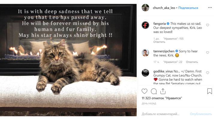 На официальной страничке Instagram кота Лео, сыгравшего воскресшего домашнего любимца по имени Черч в «Кладбище домашних животных», появился печальный пост. Его хозяин – дрессировщик Керк Джаррет, который взял его к себе после съемок, сообщил о смерти животного.