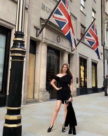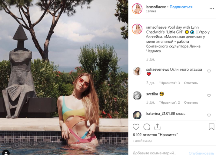Красотка выложила в соцсеть несколько фото в купальнике, в бассейне на фоне скульптуры британского художника Линна Чедвика и в платье от своей крестной - дизайнера Лилии Пустовит.