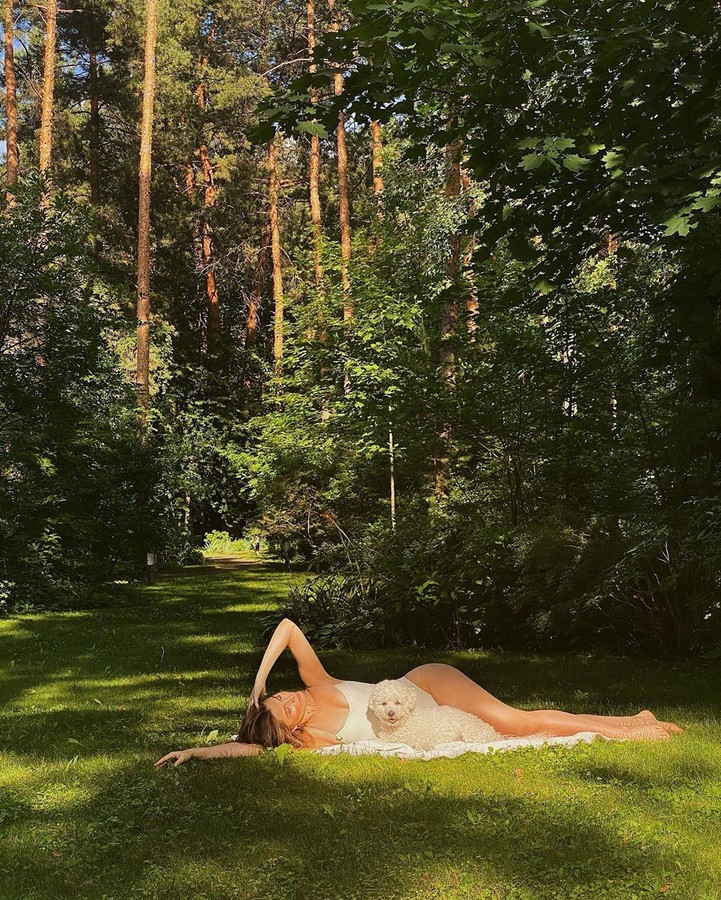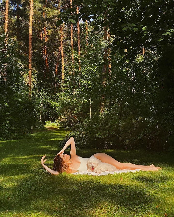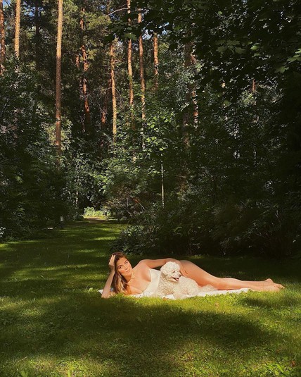 Соня расположилась на зеленой лужайке в лесу, спрятавшись от палящего солнца в кружевной тени деревьев. Рядом с ней – лохматый домашний питомец. Девушка красиво позирует, расположившись на боку и показав во всей красе стройные длинные ножки и изящество форм. Она сделала сразу несколько кадров, напоминающих больше картинки из журналов или живописные фотооткрытки.
