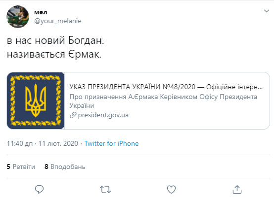 В социальных сетях пишут о том, что в Украине появился «новый Богдан», которого зовут его Андреем Ермаком. Отмечают, что здесь главное, что «новый Богдан» - до сих пор Андрей. Некоторые пользователи называют отставку Богдана - «хорошей новостью», некоторые наоборот сожалеют, что по Офиса Президента ушел «профессионал».