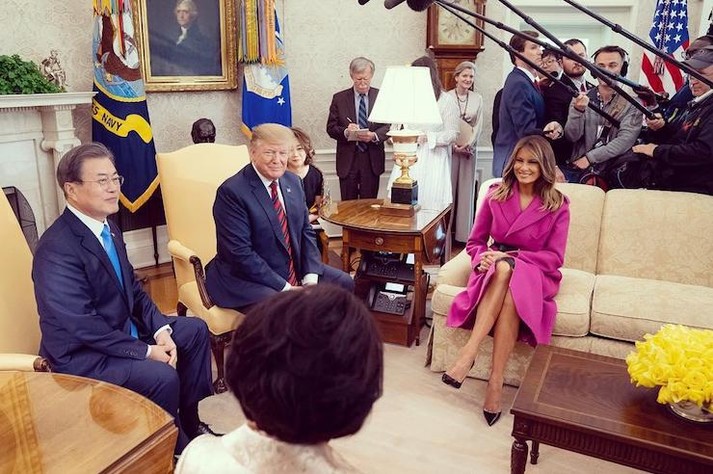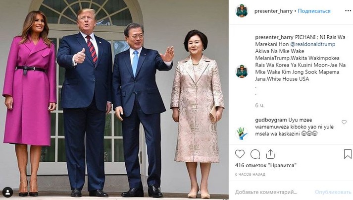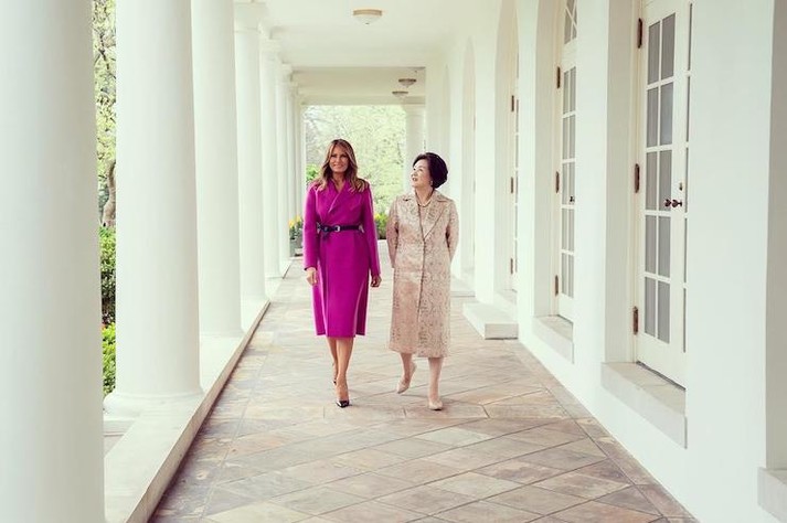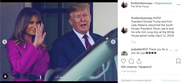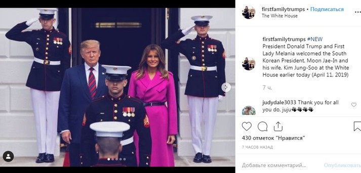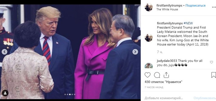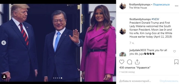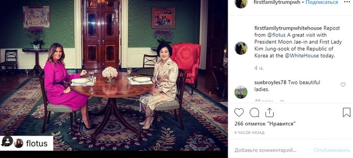 После официальной части Мелания пообщалась с Ким Джонсук, о чем рассказала в Instagram. Супруга Дональда Трампа осталась под впечатлением от гостей: «Потрясающая встреча с президентом Мун Чжэ Ином и Ким Джонсук в Белом Доме».