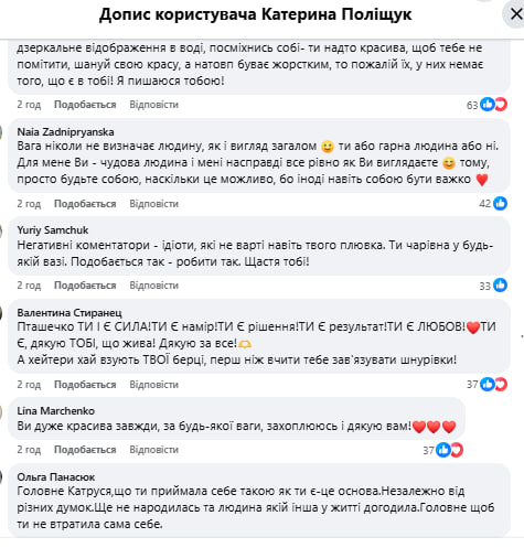 - «Як була сильною, відважною, щирою та чарівною жінкою, так нею і залишилася у будь-якій вазі! Особистісні якості не вагою вимірюються. І не кожна реакція варта уваги. Бережіть себе!»