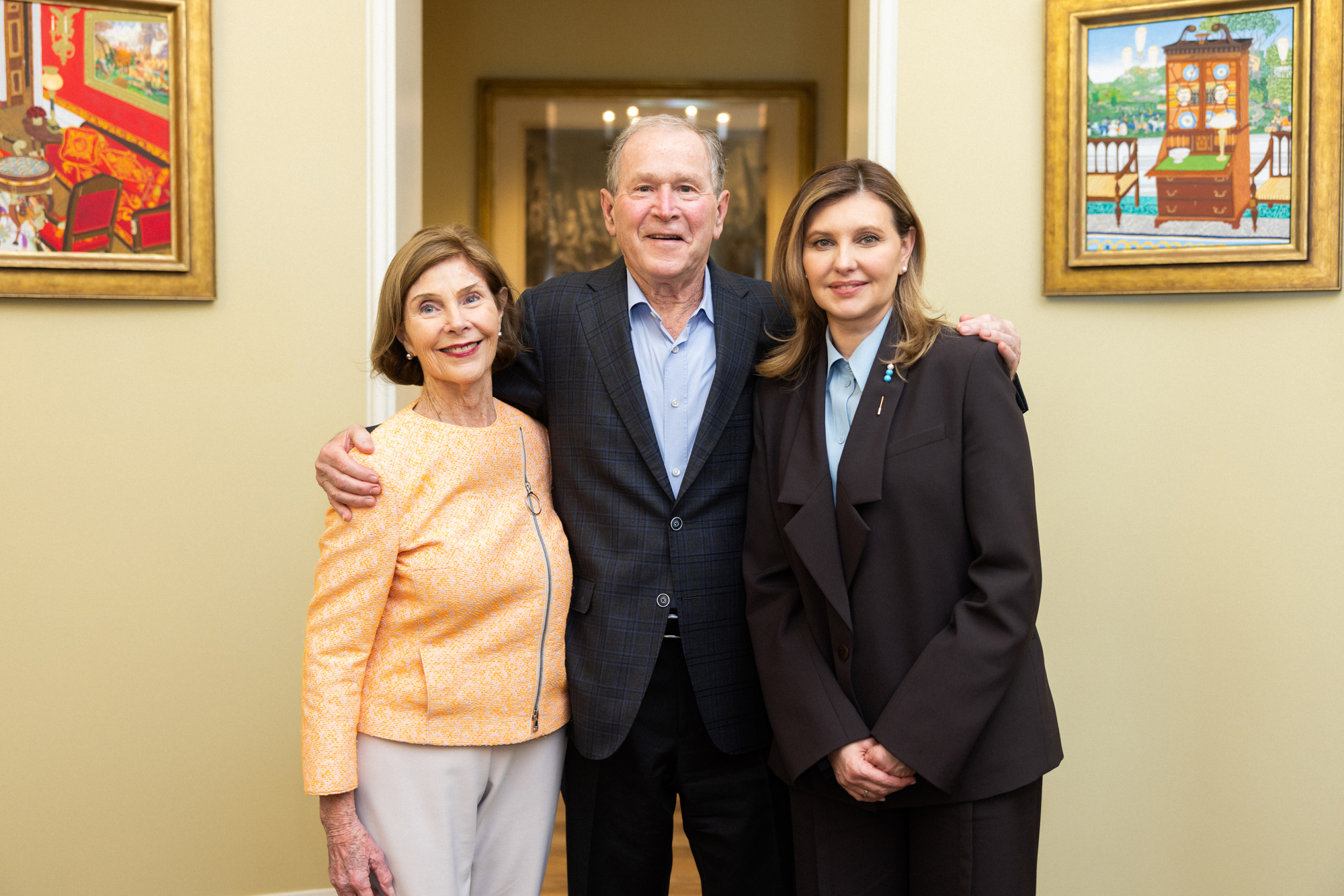 На ще одних кадрах із візиту до США Олена Зеленська показалася в більш яскравому образі. Вона обрала коричневий костюм та блакитну сорочку. А піджак першої леді прикрасила незвичайна брошка з білими та блакитними намистинами. До слова, у цьому образі Зеленська показалася із 43-м президентом США Джорджем Бушем та його дружиною Лорою Буш.
