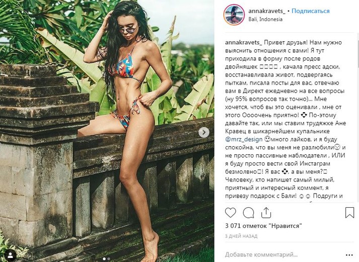 «Качала пресс адски, восстанавливала живот, подвергаясь пыткам, писала посты для вас, отвечала вам в директ ежедневно на все вопросы... А теперь, мне хочется, чтоб вы это оценивали. Поэтому давайте так, или мы ставим трудяжке Ане Кравец в шикарнейшем купальнике лайки или я буду просто вести свой инстаграм безмолвно», - написала Анна и пообещала подарок за самый «сладкий» комментарий под постом.