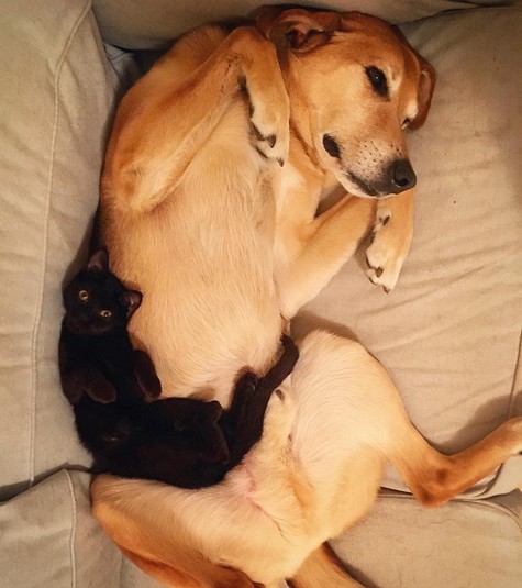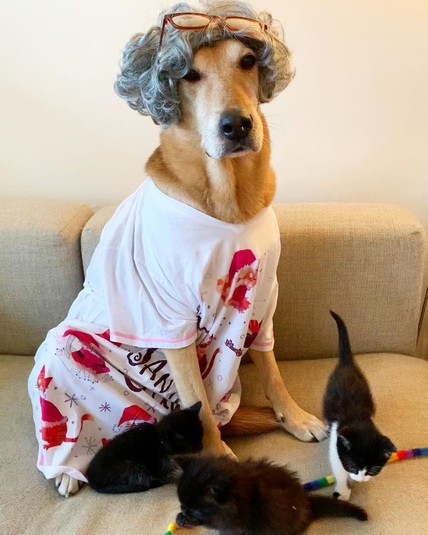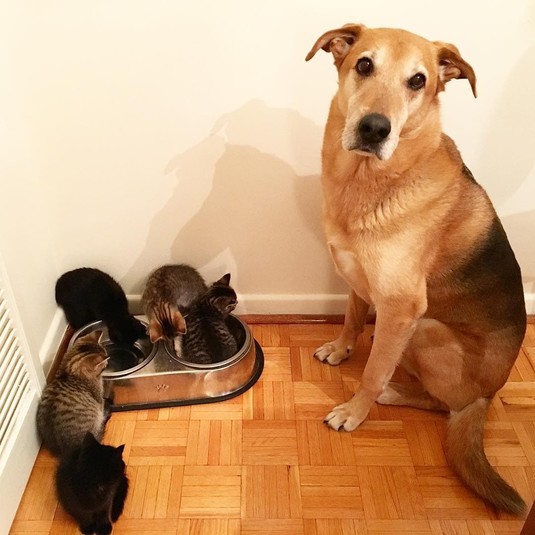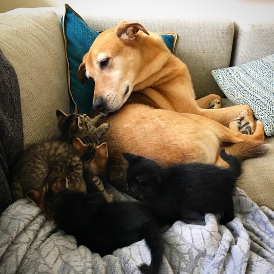 Пес Рэйлан стал настоящей приемной мамой для котят
