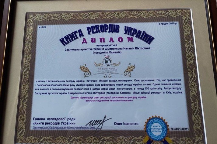 Камалия стала второй украинской певицей, попавшей в Книгу рекордов Украины. До этого свою награду получила СолоХа – она стала самой спортивной певицей Украины.