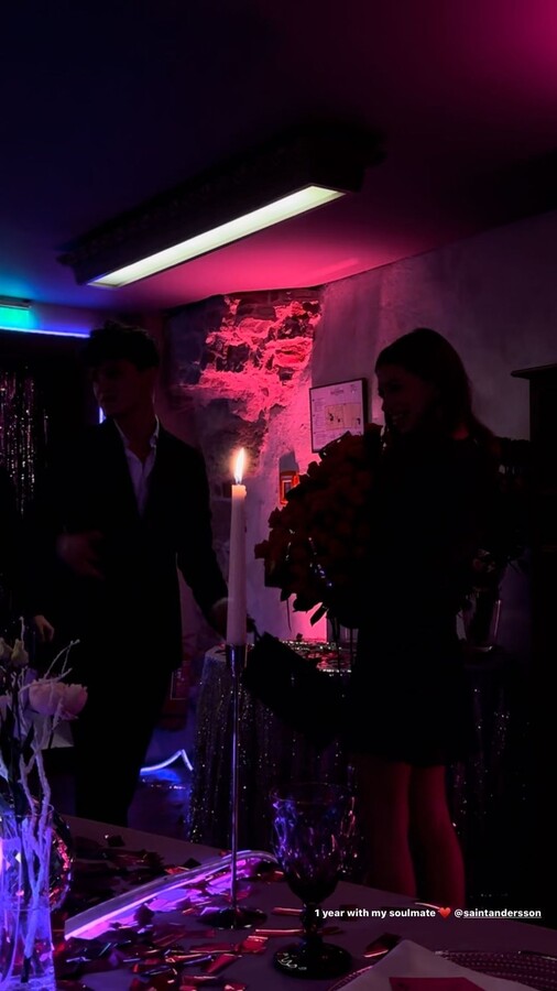 На світлині, якою дівчина поділилася в Instagram, один з гостей презентує Сарі розкішний букет троянд. Фото дівчина підписала: «Один рік з моєю спорідненою душею». Юнак перепостив сторіз Сари собі і також акцентував увагу на тому, що вони вже рік як разом.