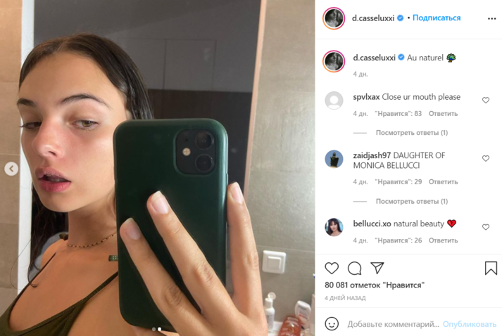 Дочь знаменитой актрисы Моники Беллуччи и актера Венсана Касселя показала естественную внешность и восхитила фанатов. Соответствующие фото появились на ее странице в Instagram.