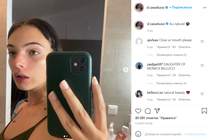 «Натуральность», — подписала манекенщица пост, который набрал 77 тысяч лайков. Подписчики восхитились внешним видом Кассель в комментариях под публикацией. «Сразу видно, что это дочь Моники Беллуччи! Красотка», «Естественная красота», «Лучшая», «Какая же красотка», «Выглядишь потрясающе, как и мать», — высказались поклонники.