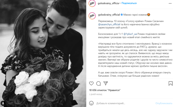 19-летний победитель вокального шоу «Голос страны» Роман Сасанчин и его 23-летняя беременная избранница Иванна официально стали мужем и женой. Информация об этом появилась 3 декабря на страничке шоу в Инстаграме.