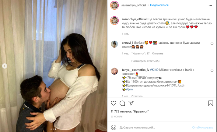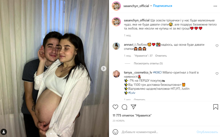 «На самом деле, все было спонтанно и неожиданно. Утром с любимой решили пойти подать документы в загс, думали, что придется ждать еще около месяца, но нас сразу обручили и мы даже не поняли, как это произошло. Оказалось, что если имеешь справку о беременности, то жениться можно через несколько минут. Вечером мы собрали родственников и друзей и символически отпраздновали наш новый статус. Обручальные кольца мы носим уже давно. А после рождения ребенка мечтаем сделать пышную свадьбу», – сообщается в подписи к публикации.