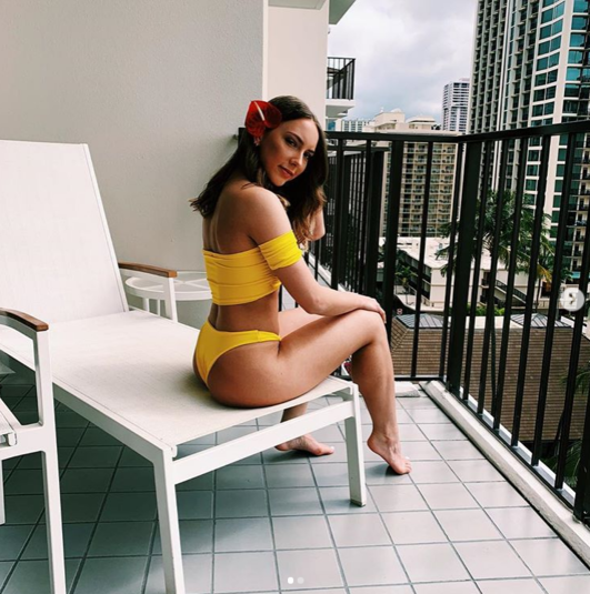Вскоре девушка разместила в Instagram снимки, на которых она сидит на белом шезлонге. На Хэйли ярко-желтый купальник, подчеркивающий загар и открывающий мускулистый плоский живот. Волосы распущены, их украшает ярко-красный цветок.