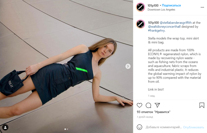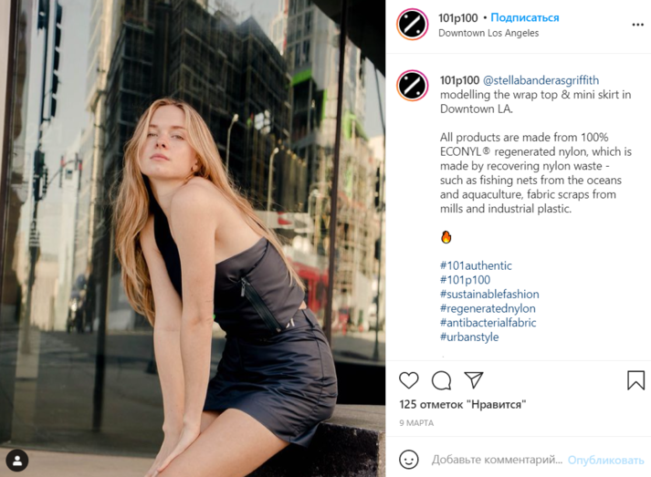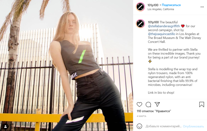 24-летняя модель попозировала на улицах Лос-Анджелеса в черном костюме, состоящем из мини-юбки и кроп-топа асимметричного кроя. Ее образ дополнил пиджак в тон наряда. Отмечается, что вся одежда 101p100 выполнена из переработанной ткани. Бандерас снялась в рекламе без украшений и макияжа.