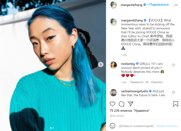 В китайском Vogue грянула смена поколений: вместо Анжелики Чунг, которая руководила глянцем более 16 лет — с момента захода культового журнала на местный рынок, главным редактором издания назначена Маргарет Чжан. Имя новой главы стало неожиданностью для многих экспертов: девушка, которой недавно исполнилось 27 лет, родилась в Сиднее, является известным блогером (более миллиона подписчиков) и специализируется на связи культуры Китая с Западной цивилизацией.
