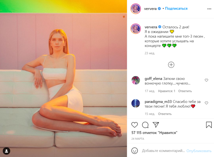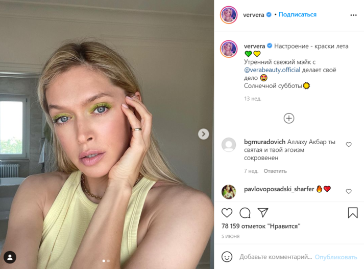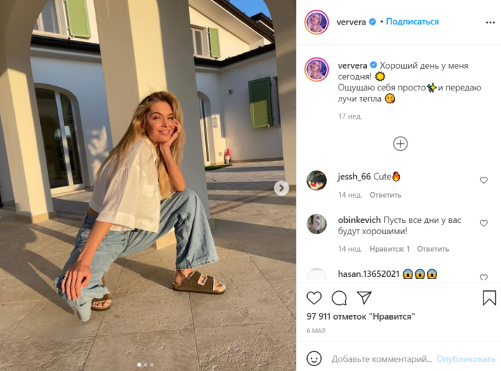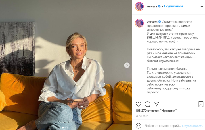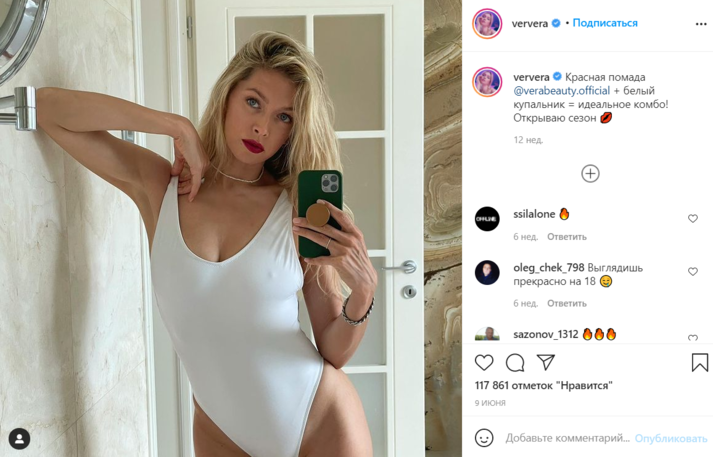 «Я тоже делаю инъекции красоты. Вопрос – как это потом выглядит на моем теле: Это просто помогает мне поддерживать кожу в хорошем состоянии? Или это меняет мое лицо до неузнаваемости? Понятно, что мне уже почти 40 лет! И мне нужны уходовые средства более сильные!! Но я все же за то, чтобы оставались свои черты лица», – отметила Вера.