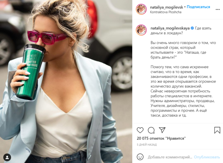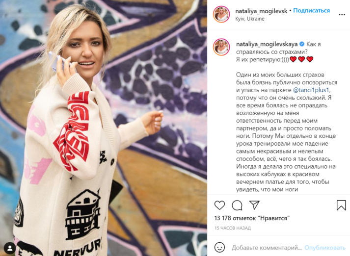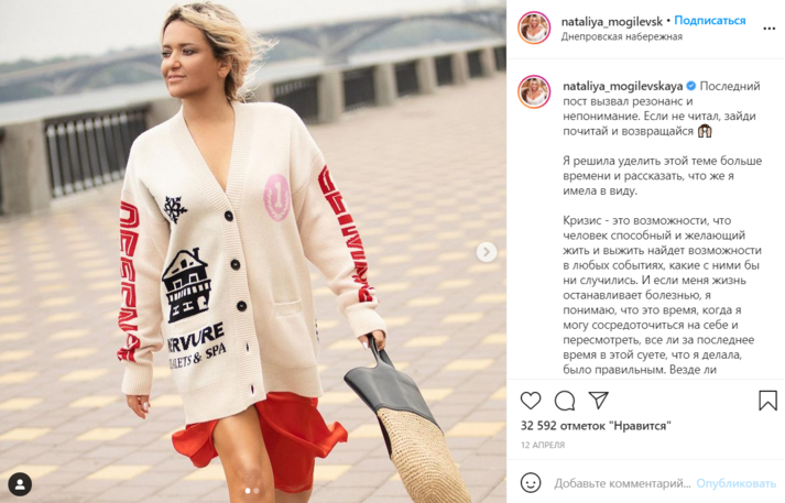 Так, на днях в Instagram Могилевской появились фотографии, где она предстала в неожиданном образе. На набережной Днепра певица сделала несколько кадров, где позирует в соблазнительном платье-комбинации красного цвета, поверх которого надет объемный белый кардиган с ярким принтом. Дополнили образ белые кроссовки и большая соломенная сумка. Волосы артистки собраны в низкий хвост, на лице чуть заметный макияж.