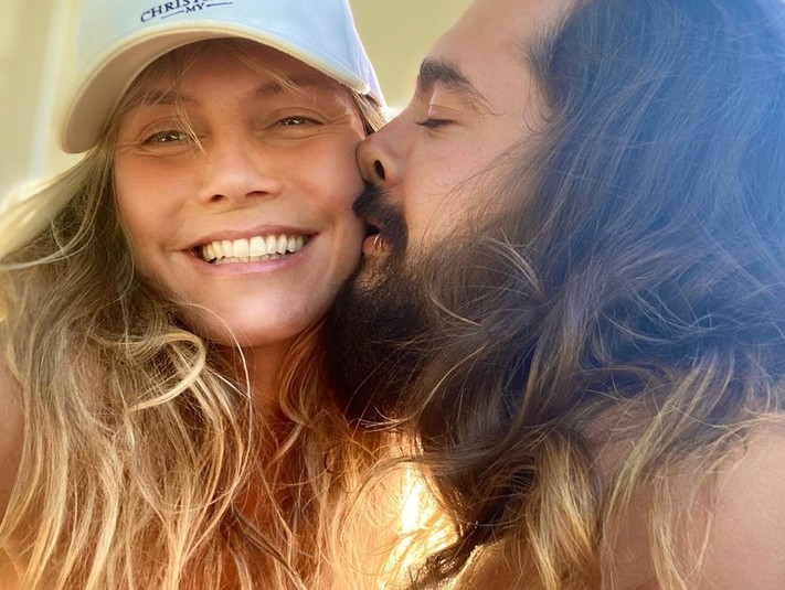 На первых двух снимках 46-летняя Клум целуется с 30-летним Каулицем в лучах солнца на веранде во время самоизоляции. На следующем фото супермодель позирует перед ним стоя, закрыв обнаженную грудь руками. При этом часть ее тела прикрыта ярко-желтым полотенцем, из-под которого видны черные трусы.