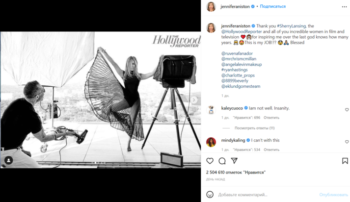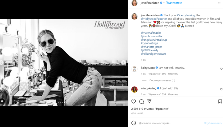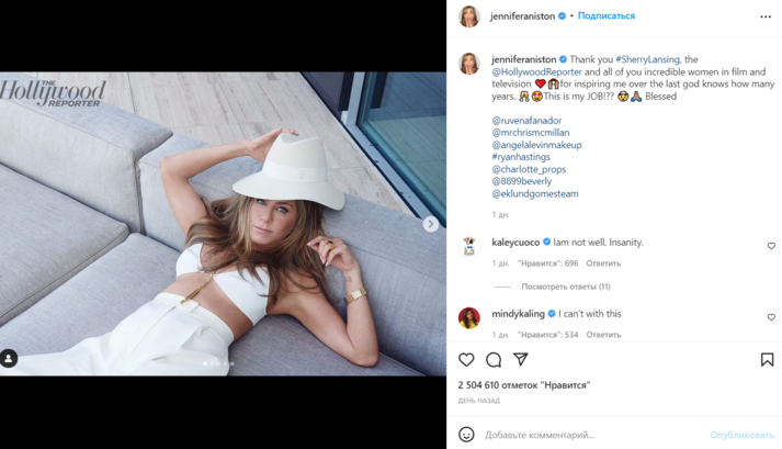 Американская актриса Дженнифер Энистон приняла участие в откровенной фотосессии для обложки журнала The Hollywood Reporter. Соответствующие кадры появились на ее странице в Instagram.