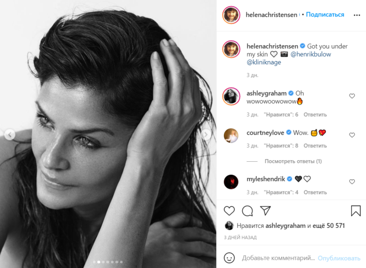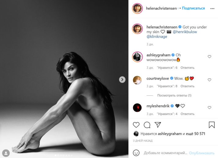 Датская супермодель Хелена Кристенсен (Helena Christensen) приняла участие в откровенной фотосессии и удивила поклонников. Серией снимков она поделилась на своей странице в Instagram.