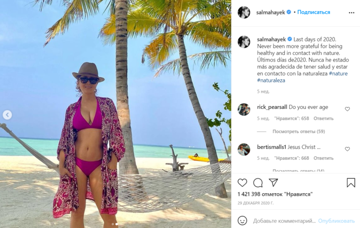 В течение прошлого года, находясь в отпуске, 54-летняя знаменитость регулярно позировала для Instagram в откровенном виде. В разговоре с репортером Хайек рассказала, что для достижения идеального тела ей пришлось усердно тренироваться в спортзале, поэтому откровенные снимки стали для нее символом свободы. «Я рада, что сделала так много кадров. И мне не было за них стыдно, ведь я была в отпуске», — сказала она.