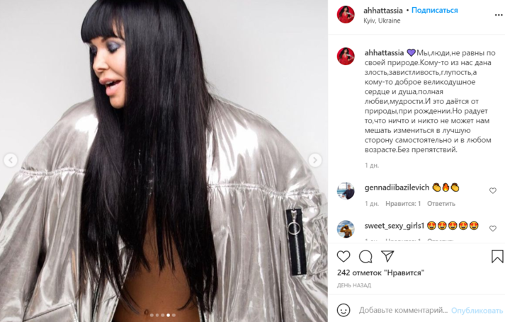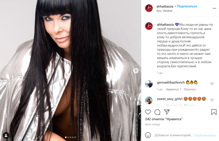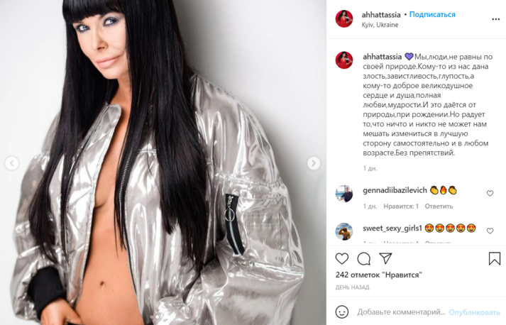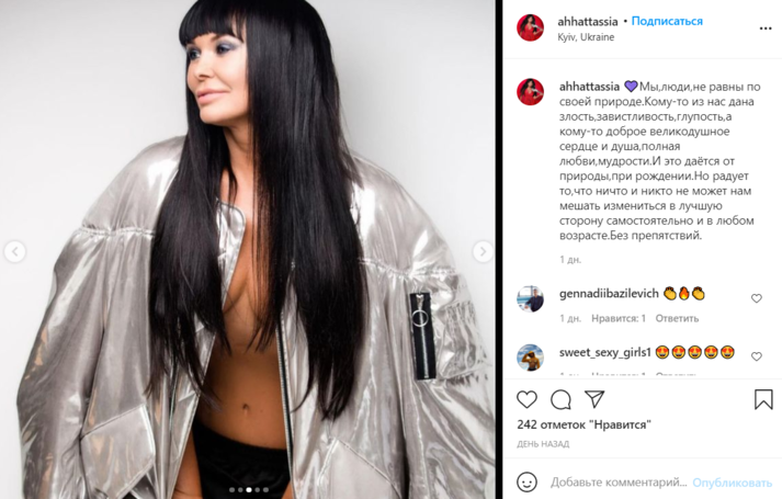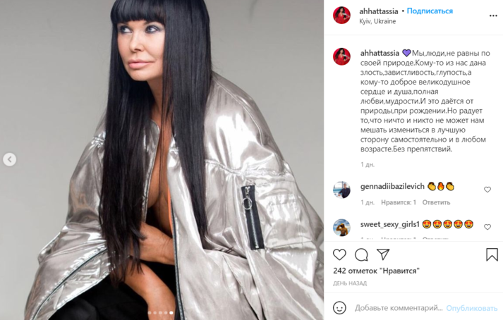 55-летняя скрипачка и певица Ассия Ахат в своем Инстаграме разместила провокационные фотографии, на которых предстоит без бюстгальтера и в серебристом бомбере. Под постом Ахат оставила свои мудрые мысли.